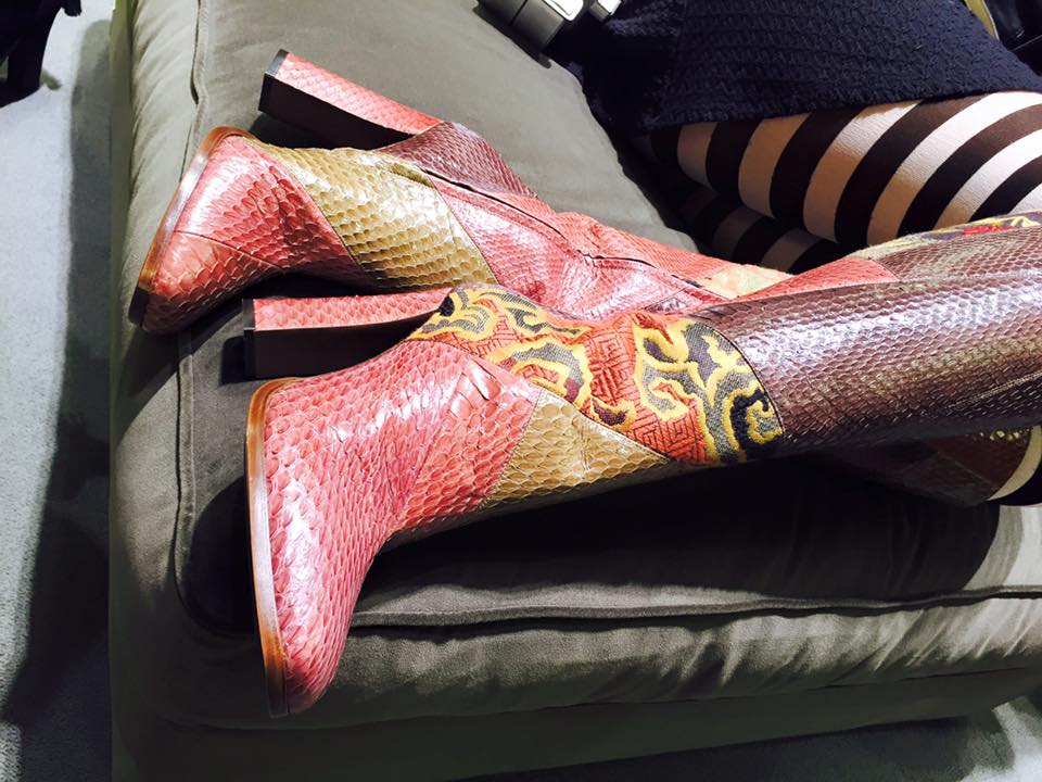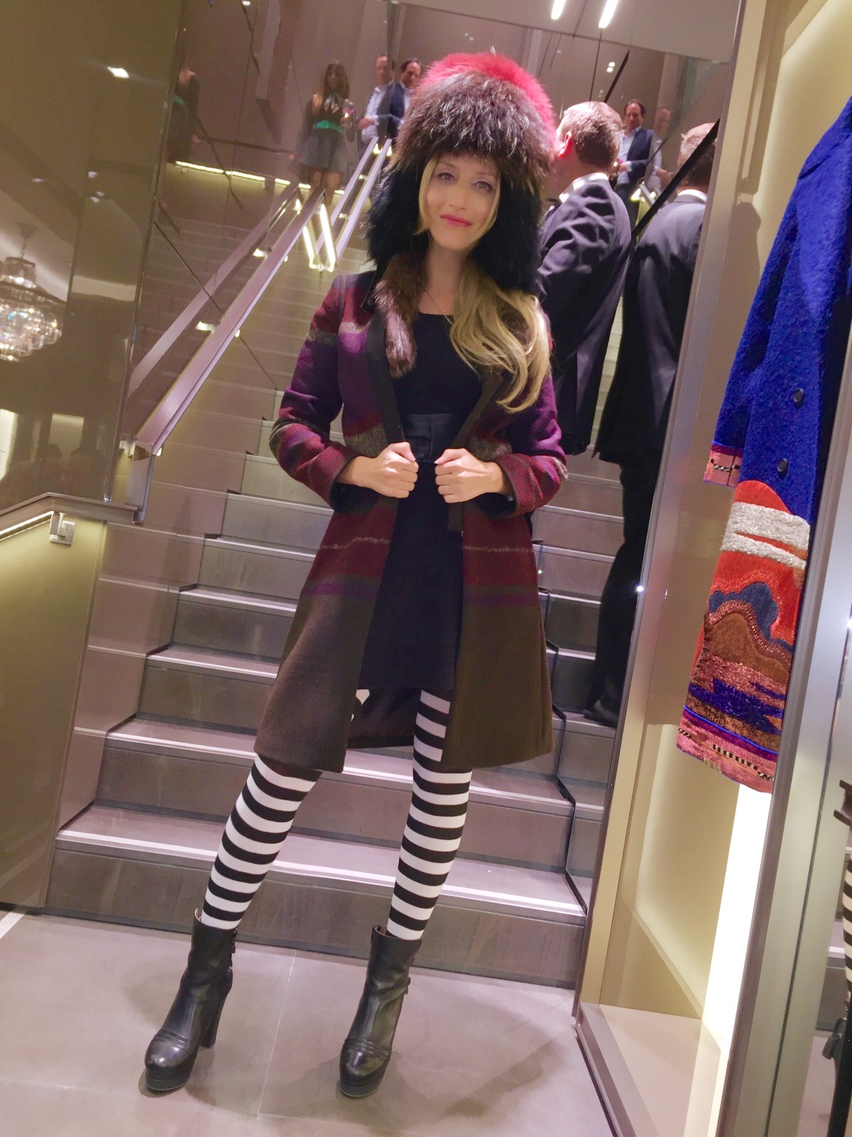 My friends were pleased to see what even though Etro was popping at the seam with people, the champagne was flowing quite quickly and there was no shortage of it for the next hours. I loved the matching Etro-colored macaroons that were served with the drinks. What a fabulous little detail! I greeted my friends and people that I knew at the party and couldn’t wait to make my way to the lower lever of the 210 square meter store. I was there for the fashion and new collection! I couldn’t wait to get my hands on the new styles and fabrics. I set my girls on a mission to show me their favorite outfits. My favorite “ETRO LOOK” for the evening was a colorful wool knee-length coat – mainly made of khaki, brown and purple shades – topped off with a matching big Russian-shapka-style furry hat. Since I was deeply inspired by Jean Paul Gaultier’s collection at the Dominicana Moda a few weeks ago, I had to wear something with stripes, so I put on my crazy Gaultier pantyhose. Of course they totally clashed with the coat and hat, but in a strange, circus-Buckingham-Palace-guard kind of way, the entire outfit worked! At least I thought so – some would beg to differ of course. I fell madly in love with this wild outfit! In my opinion, perfect for almost any occasion! (See photo below).