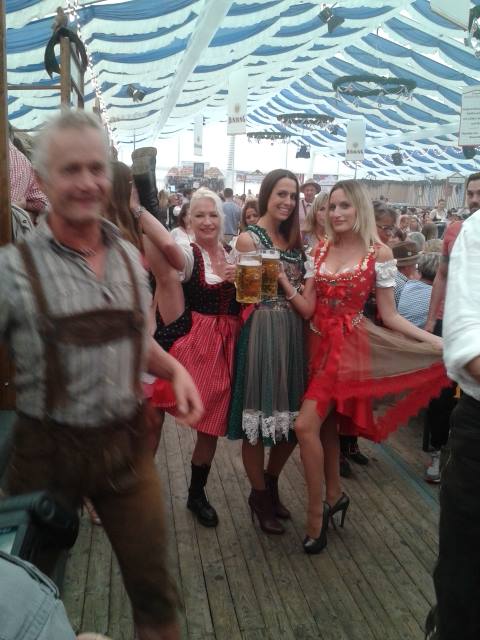 The adventure started at the Nymphemburg Sekt Bar inside of the wine tent. This was a great place to get into the Oktoberfest mood, because that’s where the band plays the loudest, craziest music, the people like to party and the wine flows by the gallons! We were 10 girls, and took up the entire left bar area. The first sip of cold Riesling after the long journey was fantastic, because I’m not a beer drinker. Everyone was in an amazing mood, people were singing along with the band, eating the Bavarian delicacies, drinking their beer by the Maas, and kissing their partners – and also other people’s partners at any given opportunity. I couldn’t help but notice how many attractive people were in Munich that weekend! Every other man was incredibly handsome, had a charming smile, and looked simply delicious in his Lederhosen – which helps to show off their bums and calves to a perfection! I was definitely doing many neck exercises, turning my head left and right to get a glimpse of it all. The women were glamorous and very seductive, with their hair done in braids, and their cleavage screaming out for freedom. There was a lot of sexual tension in the air. The next stop was the Käfer’s Wies’n-Schänke, where we had a table upstairs. As we got there, I couldn’t help but notice that beside us was a table with a very famous footballer from the FC Bayern team. My one-and-only Jilli sat beside me, and he saw her right away. Needless to say, it would be a very interesting night.