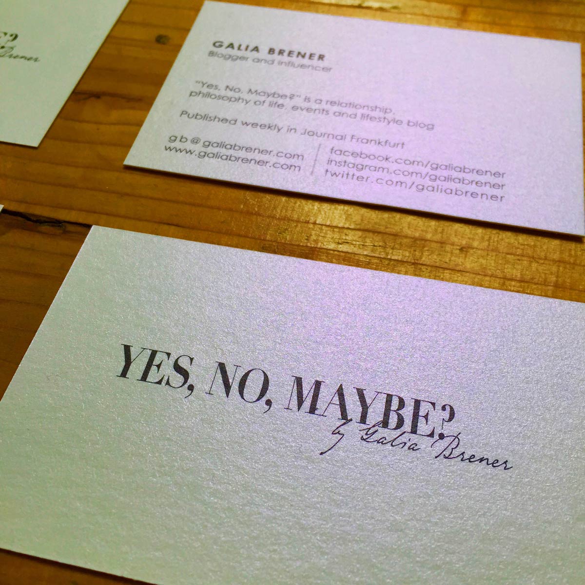 My new business cards have arrived! I am so happy with the design and the pearlescent-colored paper. Happy Gali ♥