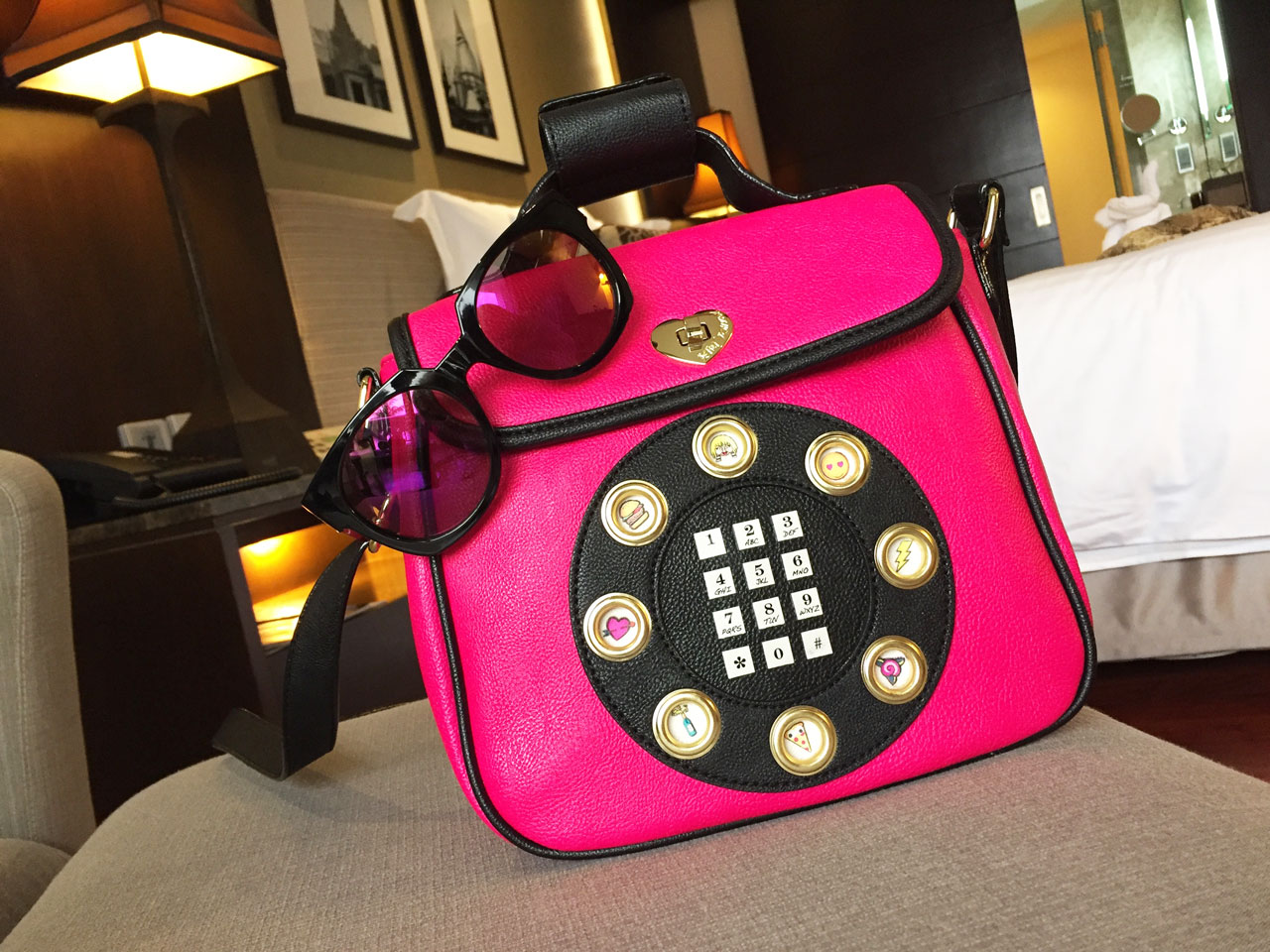 We arrived in the Thailand paradise. Since I had a camera team always with me, including jet lag in the mix, having my funky pink reflector shades was like a gift from the heavens above. Just like a shield is a source of protection and comfort to the knight, the wild accessories are like a source of magic and seduction to the warrior princess. I managed to walk the complete food and spice market in Bangkok wearing my glasses from Mars, while being filmed with the sous chef from the Lebua hotel. The cool thing was that we both wore our shades inside, like mischievous partners in crime, while the camera kissed our alien bug faces. After the cooking class, we went shopping and I changed faster than the speed of light into my star-struck dress, accompanied by a unique pink colored telephone-shaped handbag. As soon as I saw these accessories at TK Maxx, I knew that they are going with me on my adventure to the City of Angels. Little did I know that the funky telephone bag will be a star of its own.