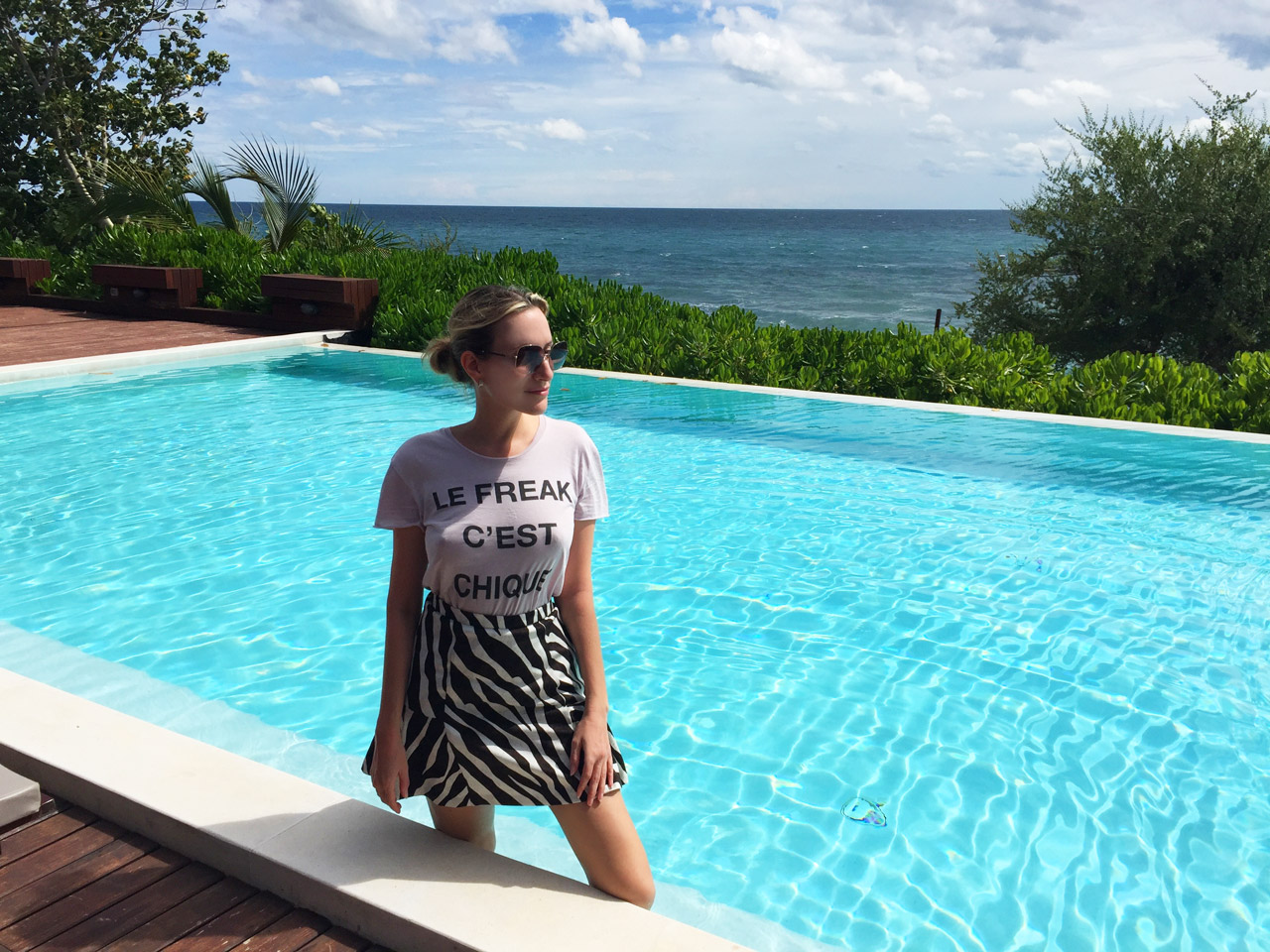 As I laid eyes upon the “Le Freak C’est Chique” bamboo cotton t-shirt at TK Maxx, I knew that this will be my “pièce de résistance” for the journey, combined with the sensational zebra pattern clash skirt. What is a better time to wear such beautiful things than lounging around a luxurious pool? I used to always go to the pool wearing a bikini and a simple thing to cover it. Well that was the ancient past. 2017 is a time to make an unforgettable statement that will make those jaws drop and heads turn. A true fashion rebel is afraid of nothing and no one!