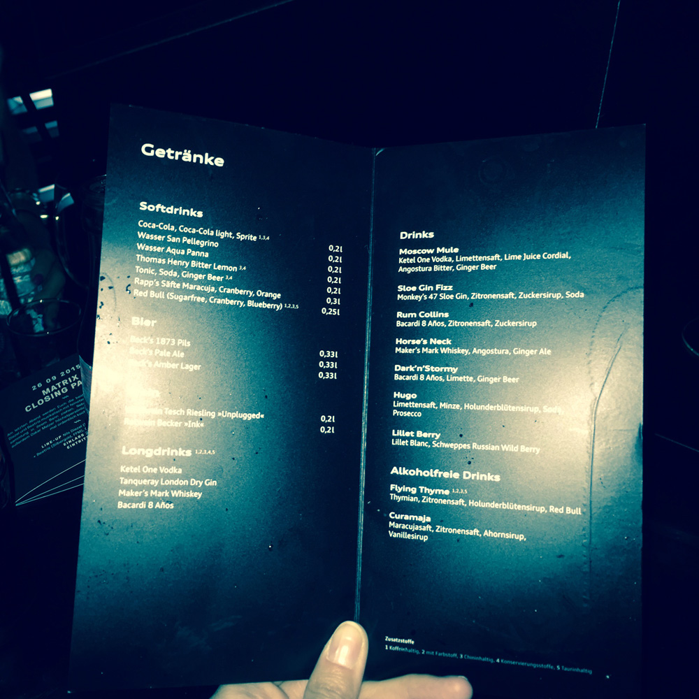 The beautiful new Audi A4 Quattro was presented on the ground level in the middle of a bright white spherical area. The contrast of the red car in the white dream-like sphere was amazing! The surreal journey was starting. We were handed a white Audi bracelet, told that this shall be our close companion and guide throughout the night. The elevator doors had white laser lights and a bright red interior, which took us to the top level of the adventure. As we got out of the lift and stepped into the room, it was indeed like stepping into the Matrix! My breath was taken away for a few seconds. We found ourselves inside of a large dark round room, with an intrinsic dome roof. It was made of many squares that got smaller towards the peak. On these squares were numbers and digits running down, like a code being generated in the Matrix! It felt like being in an ancient building in Rome, but directly in the heart of Frankfurt! DJ duo Andhim were situated in the middle, surrounded by a large bar area. The floor had computer motherboard-like marks, which were glowing with interchanging white and red lights. On the outer edges of the room, there were futurist virtual reality stations, waiting to take the VIP guests on an Audi tour in another galaxy. On our way to the bathroom we stumbled into a secret room with black light activated art on the walls. There was a bar with a huge variety of gins and tonics. Apparently this was the infamous gin room offering its many different delights.