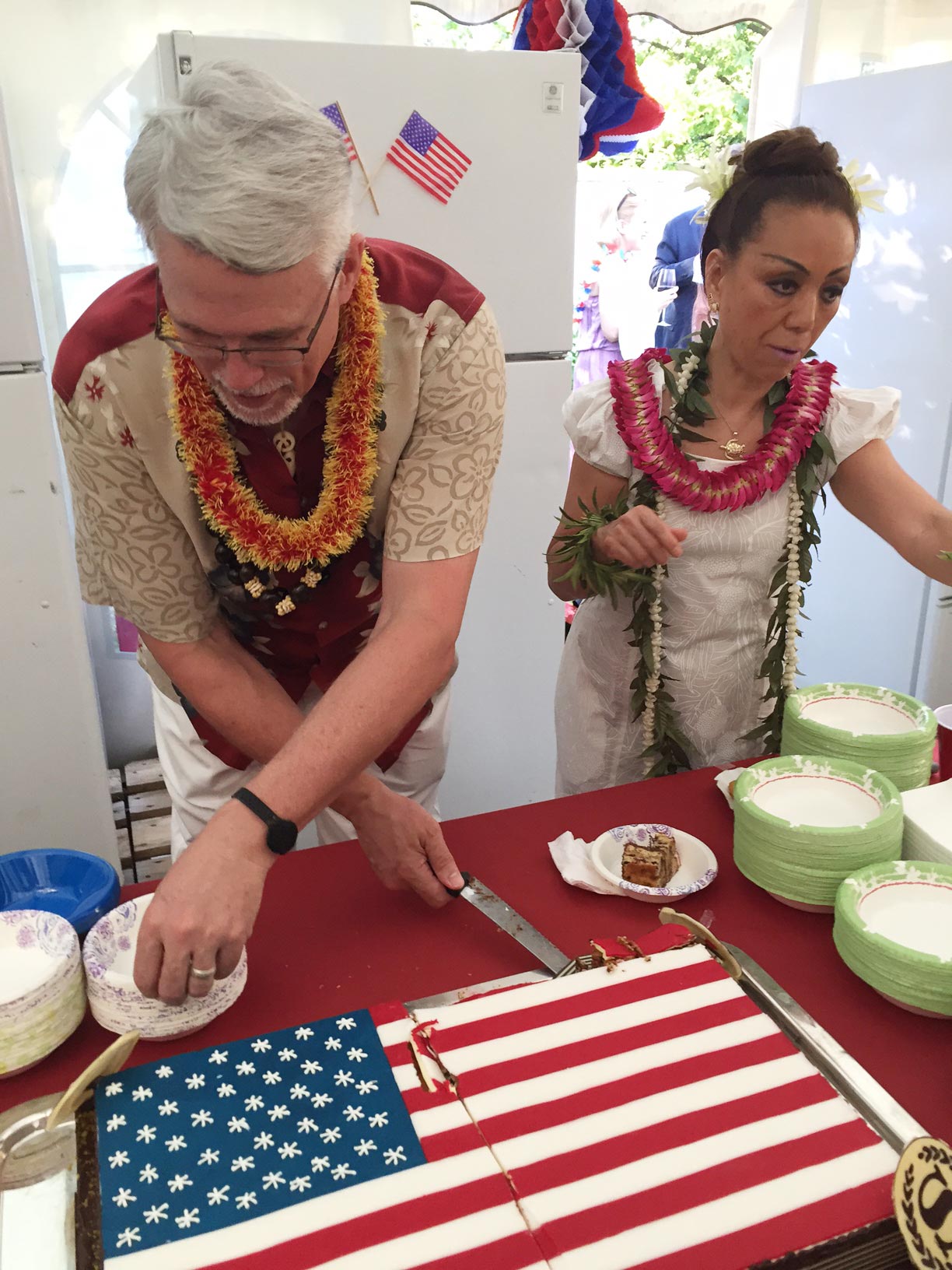 The big day had arrived and the Breners set out on a delicious barbeque adventure! I have been waiting for the special Independence Day celebration for a while now and was happy to throw on my island clothing topped off with my favorite pink cowboy boots. Upon our arrival, the Consul General of the United States of America, Mr. James W. Herman and his beautiful wife Leilani Herman, greeted us warmly into their residence. Mr. Herman gave a wonderful speech, making all his guests feel at home.
