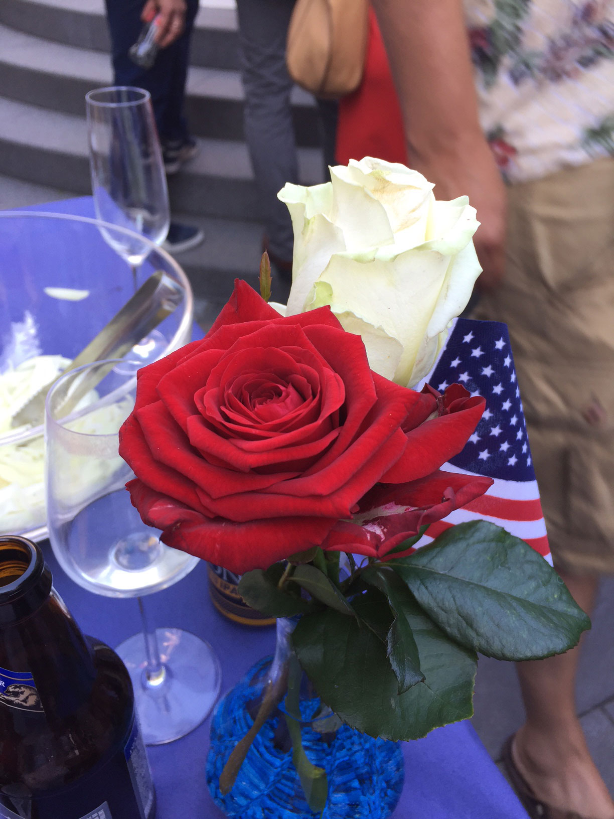 The garden was immaculate and every tree and bush was trimmed to perfection. There was a big white tent set up in the middle and around were many lovely sitting areas, perfect for mingling and eating. As I walked inside the tent, I saw Mr. Herman and his wife, cutting the delicious Independence Day cake and handing out colorful pieces for their guests to enjoy. Another sweet attention to detail were the cream-filled donuts, with the American flag painted in savory glaze on top. Such a creative and tasty idea!