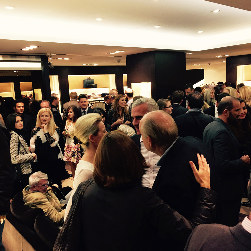 Our first stop was the chic Ermenegildo Zegna store located on the Goethestrasse. This fabulous Italian designer – who creates timeless pieces for men – joined forces with Maserati to bring us the glamorous Italian flavor on this chilly evening. As we arrived the store was already full and popping at the seam with Frankfurt VIPs, celebs and stylish cool people. The location was lined up with beautiful new Maseratis outside and men with chic black Zegna suits protecting them. Knowing my love for cars and choppers, I got stuck in front of the cars, observing every little detail and gadget – I was very impressed! Inside the mingling was already strong in action. As we stepped in, we were given a glass of cold rosé champagne and delicious bites of Venchi Italian chocolates. Not to be missed in action were both CEOs – Gildo Zegna and Harald J. Wester of Maserati. The guests were enjoying themselves – drinking and shopping simultaneously, smiling and having a good time. The event was organized by Frank Kuhlmann, who did a great job of bringing the interesting people together. I enjoyed looking at the new collections that Zegna had on display. I fell in love with a particular dark gray wool suit – fit for a king, or at least James Bond! I was happy to see many of my acquaintances, which I have not seen in a while, chat with them about life and also meet new interesting people.