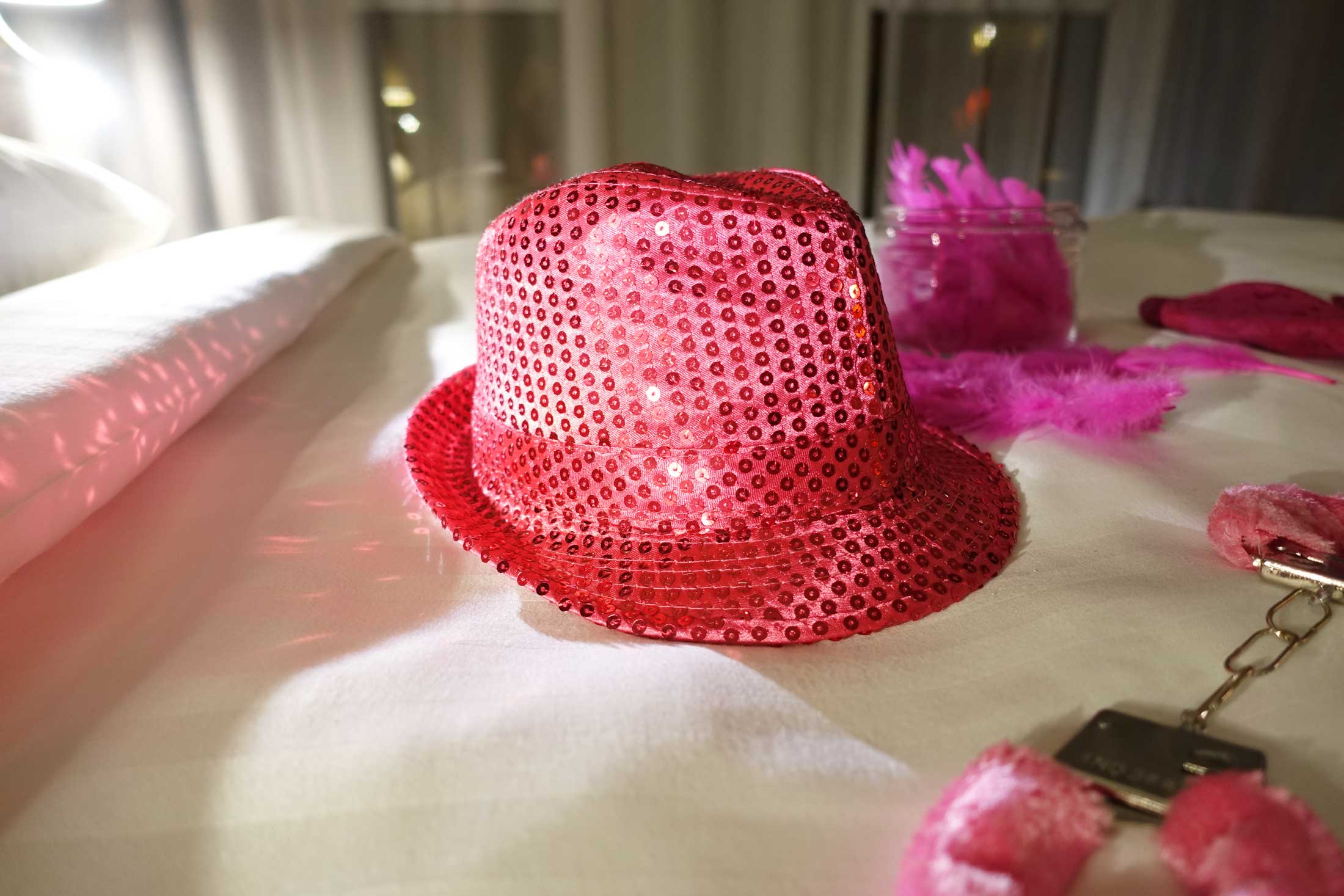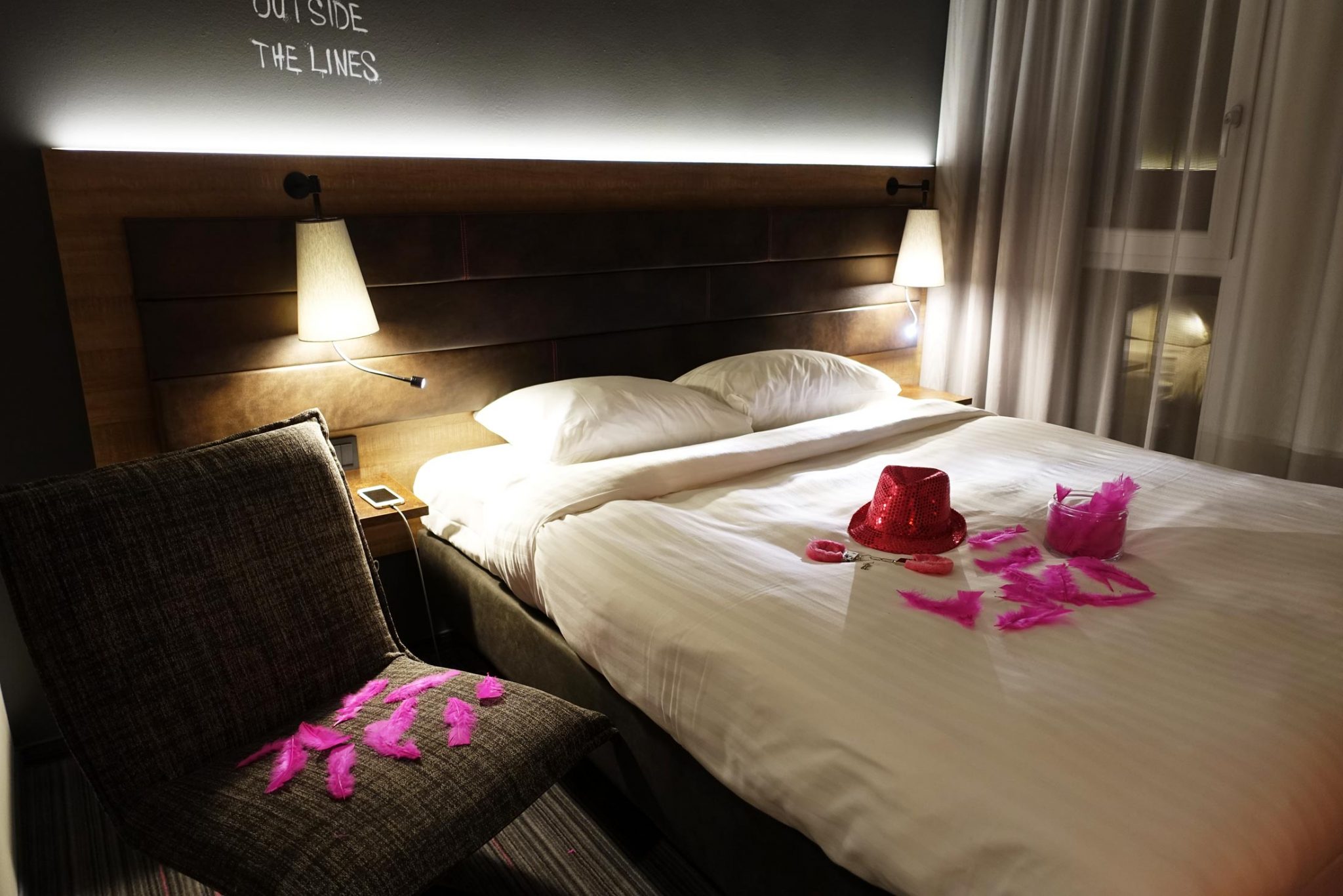 I took the elevator to the 7th floor and had to laugh out loud when I saw the crazy surprise. The entire door of my room was covered with a “Crime Scene – Do Not Cross!” tape, like that of a real crime scene. What a wildly creative approach. Of course that made me want to open the door even faster! Stepping inside was like entering an unpredictable Fairytale. The wall was covered with a huge photo of a sensual woman covered in pink paint. The bed was decorated with feathers, a pink sequence party hat and the craziest of all – pink furry handcuffs with the keys beside them! There were bold slogans written all over the walls and many eclectic records around a pink record player. I have never seen anything like this before! What I adore is attention to details – and this Moxy hotel is definitely an expert in that.