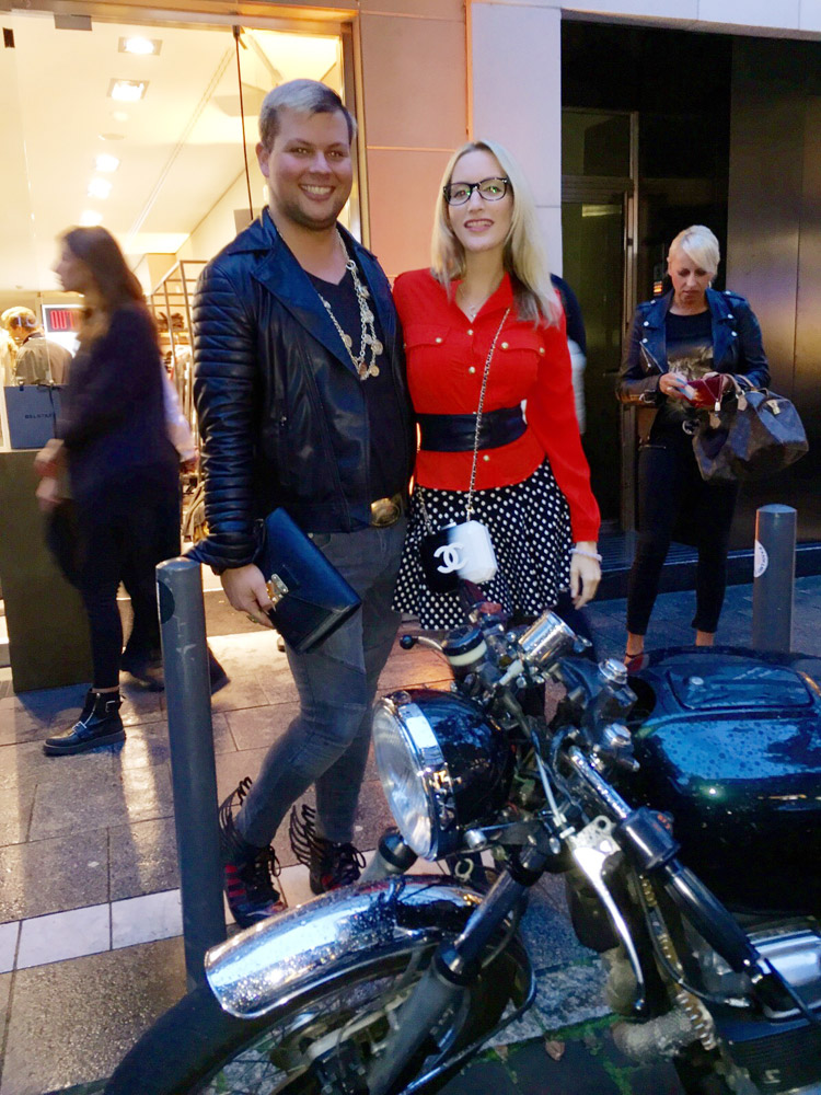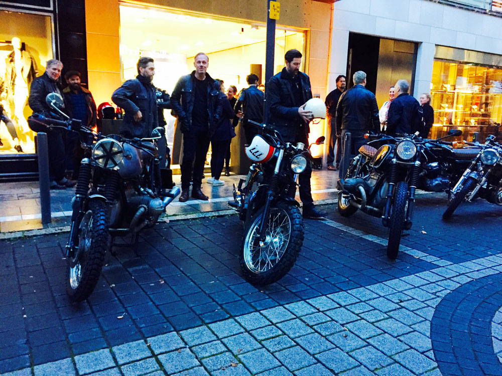 As I walked down the glamorous Goethestrasse, I was dazzled by the lights shining in my eyes. For the first time in a long while, I decided to wear my prescription Ray Bans to contradict my bright red Paris-inspired outfit. I was happy to see my two friends Jens and Olli waiting for me at the front of the store. Life is always better with smiling friend that are happy to see you. I hugged them both, and suddenly my attention was ripped away! The entire front of the store was lined with amazing bikes! Everything from BMW to Triumph and Harley Davidson. Goethestrasse has been graced by our handsome biker men, who came to admire the new Belstaff collection. Knowing my intense addiction to choppers, I couldn’t take my eyes off the machines. One was better than the other! After drooling over the bikes for a good 20 minutes, it was time to enter the cool pop up store.