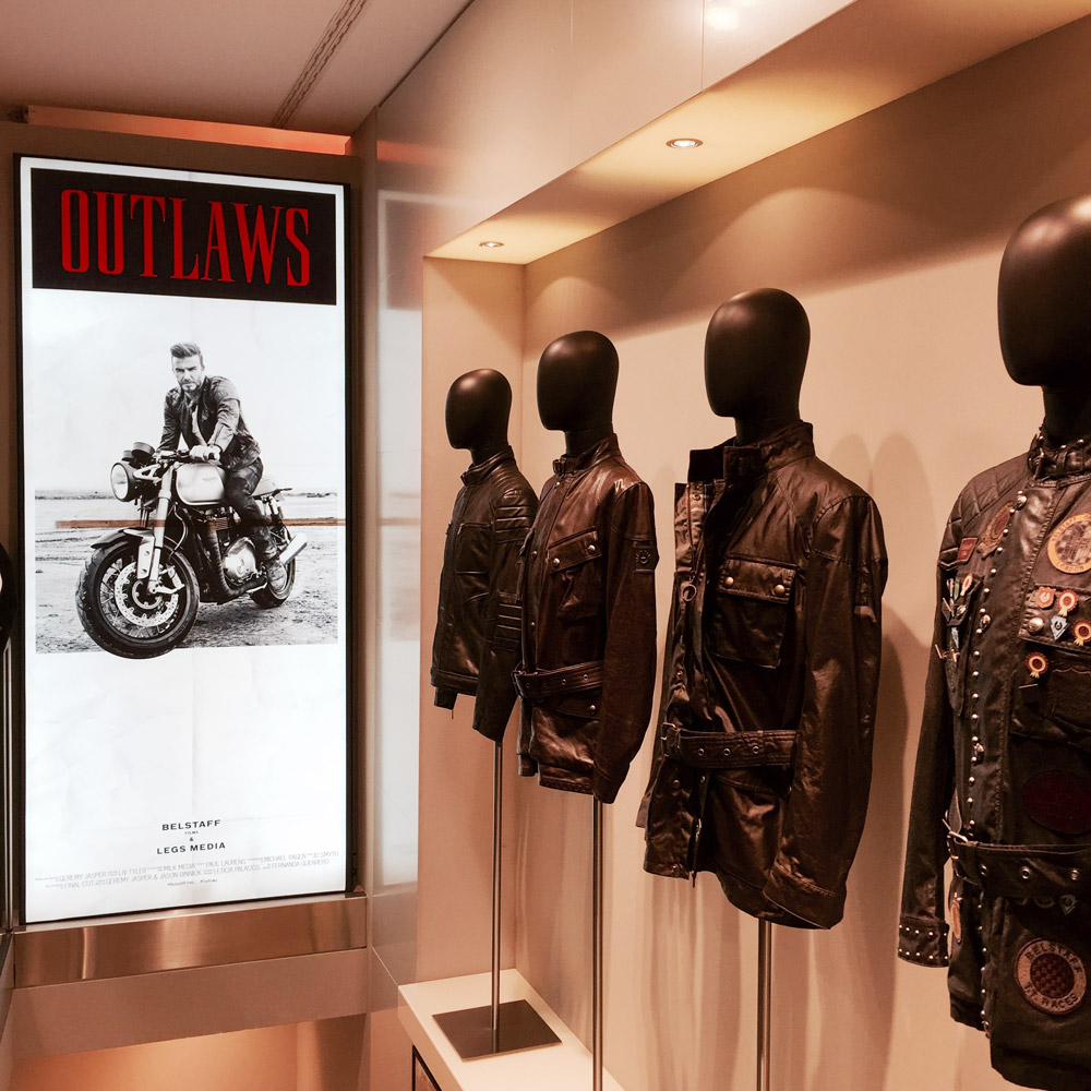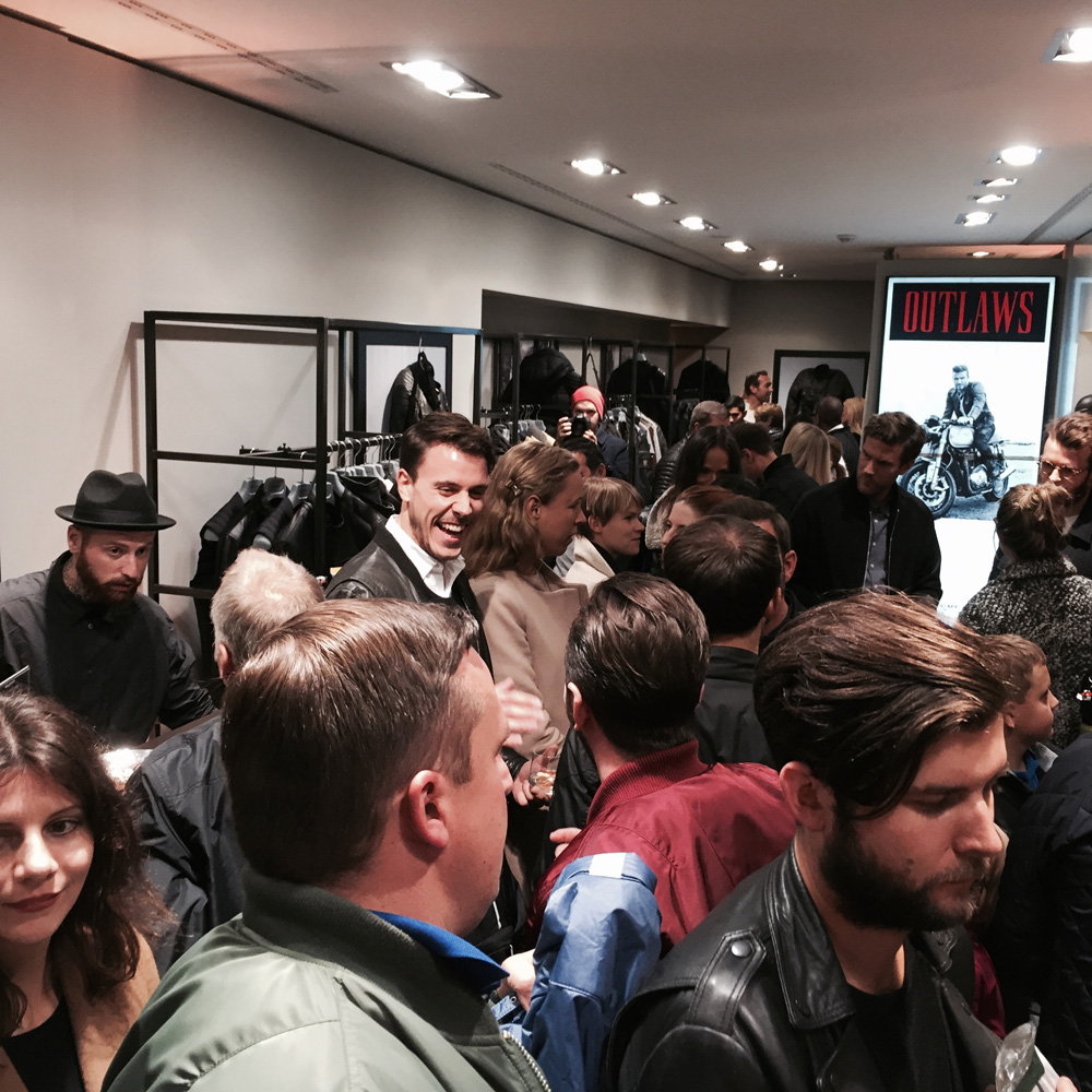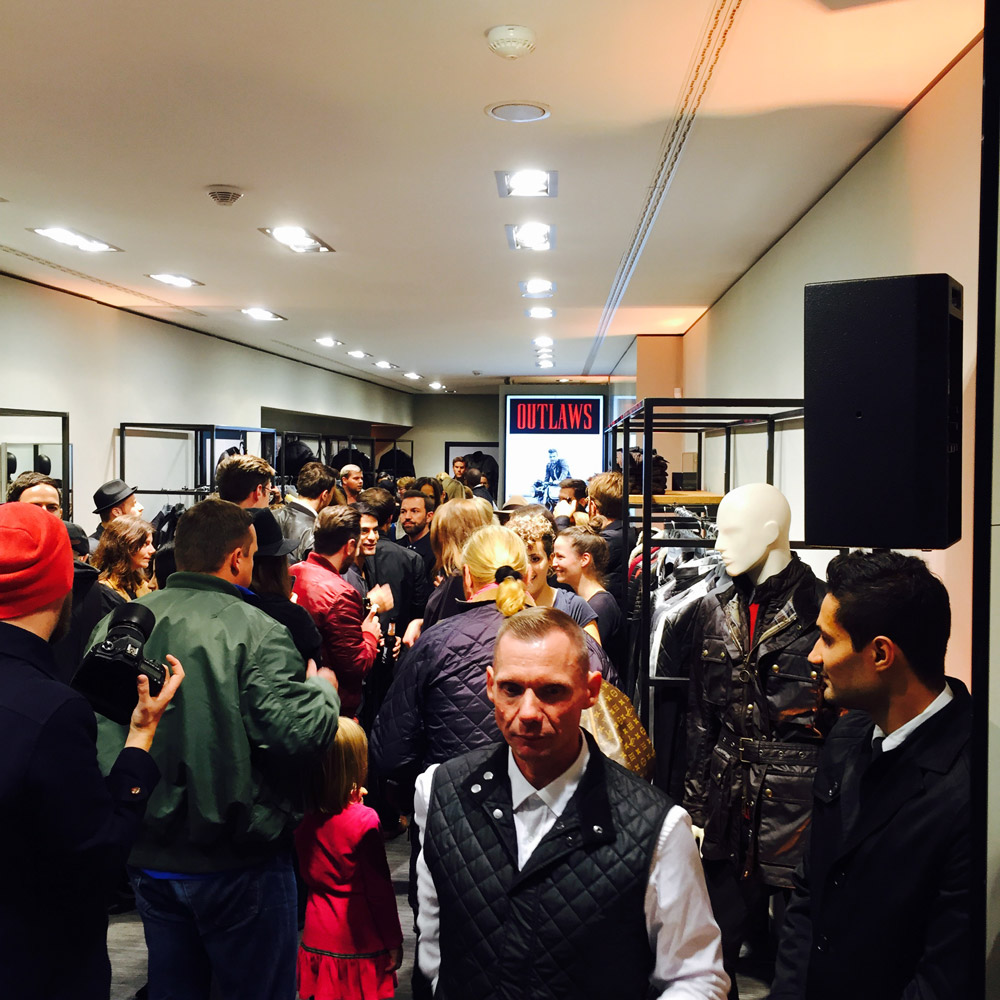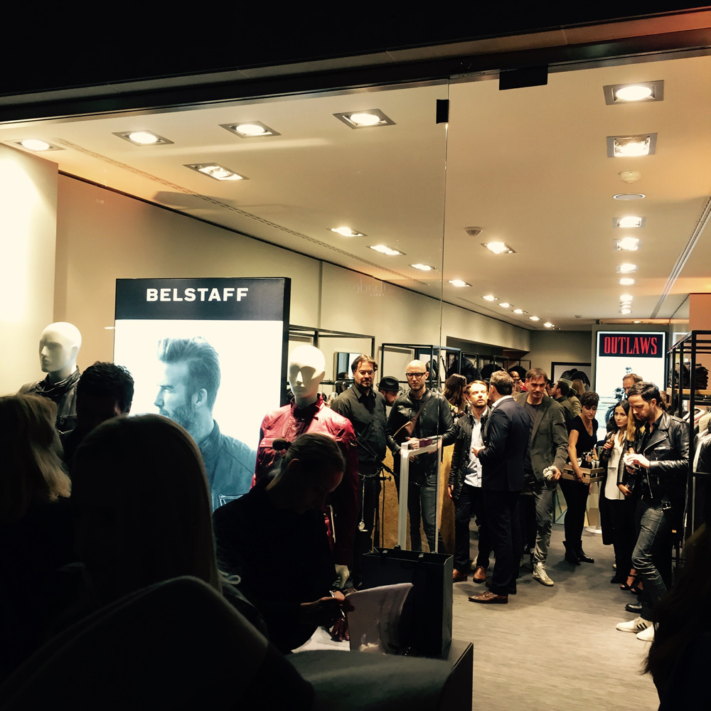 The first sight that my eyes landed upon were two beautiful ladies that offered the guests a tray full of goodies – including Balvenie Whisky single barrel, Old Perth blended malt, Craft Beer, fine chocolates and other delights! I was pleasantly surprised to see that many of the guests were in attendance wearing their own Belstaff jackets, proud to show that they have good fashion sense. As we moved further into the store, I was warmly greeted by Daniel Tobias Etzel of WAOH, who is the man of Frankfurt when it comes to fashion and lifestyle events and opening parties. Once again, he did a fantastic job at organizing this Belstaff opening event and made sure that the brand got the real welcome that is deserves in Frankfurt! I’m pleased to say that we are the second city in Germany who is privileged to have this iconic British brand. Continuing with our tour of the store, I saw a huge glowing sign saying “Outlaws” with David Beckham’s handsome face starring back at me. He is Belstaff’s proud testimonial of 2 years, with his own capsule collection.