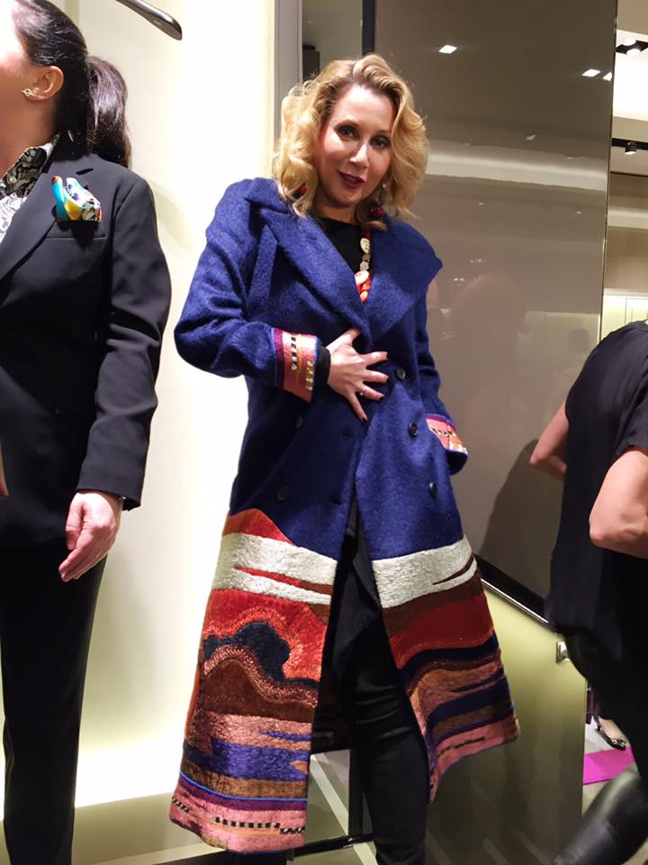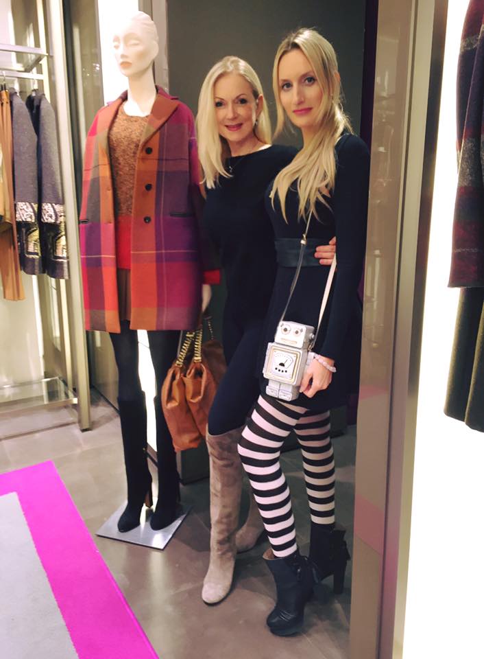 My friends were pleased to see what even though Etro was popping at the seam with people, the champagne was flowing quite quickly and there was no shortage of it for the next hours. I loved the matching Etro-colored macaroons that were served with the drinks. What a fabulous little detail! I greeted my friends and people that I knew at the party and couldn’t wait to make my way to the lower lever of the 210 square meter store. I was there for the fashion and new collection! I couldn’t wait to get my hands on the new styles and fabrics. I set my girls on a mission to show me their favorite outfits. My favorite “ETRO LOOK” for the evening was a colorful wool knee-length coat – mainly made of khaki, brown and purple shades – topped off with a matching big Russian-shapka-style furry hat. Since I was deeply inspired by Jean Paul Gaultier’s collection at the Dominicana Moda a few weeks ago, I had to wear something with stripes, so I put on my crazy Gaultier pantyhose. Of course they totally clashed with the coat and hat, but in a strange, circus-Buckingham-Palace-guard kind of way, the entire outfit worked! At least I thought so – some would beg to differ of course. I fell madly in love with this wild outfit! In my opinion, perfect for almost any occasion! (See photo below).