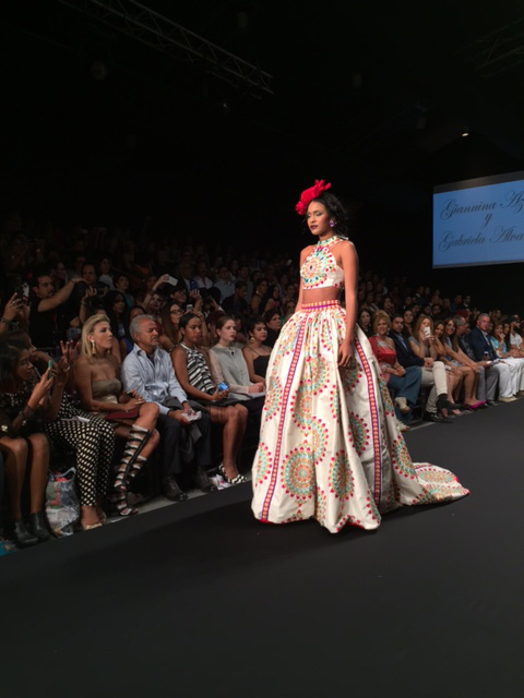 Next up were Guerrero and Budet, who threw bright colors directly into our thirsty eyes. Now I understand even better what Jean Paul Gaultier was saying about the colors here. Not only is the nature so colorful and beautiful here, but people also design and wear really bright colors too! It’s like a breath of fresh air to me, because I have gotten so used to the black, natural and gray shades of Europe. I enjoyed looking at the extravagantly colorful and flowing ball gowns. It would be definitely fun wearing something like that to the Sport Press Ball or La Scala – believe me, nobody would ever forget you! Now that we were definitely awake, the male models started coming out in funky-printed swim shorts. Who can complain about tall, handsome, exotic and muscular men walking around in tight shorts? Now that’s what I call the sweet advantages of sitting in the front row – up close and personal!