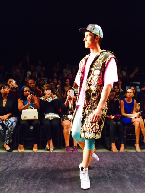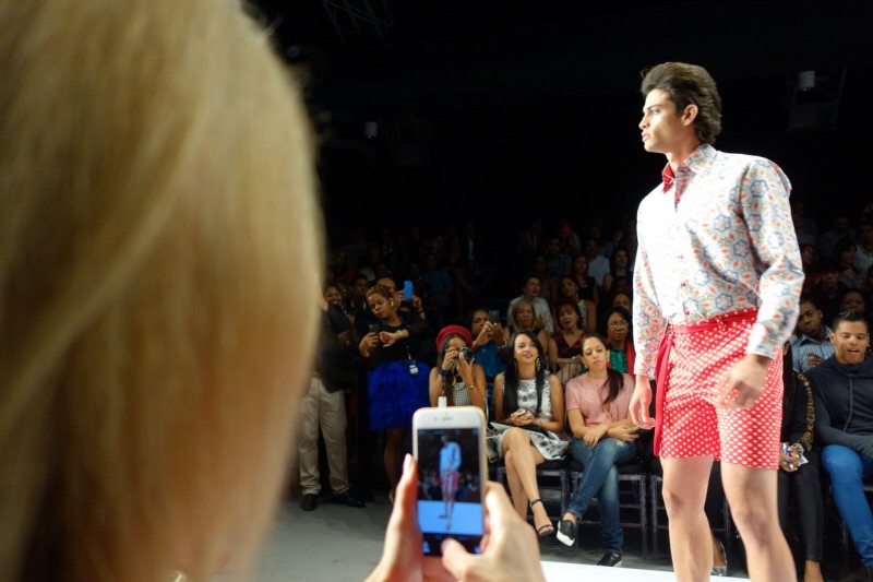 Next up were Guerrero and Budet, who threw bright colors directly into our thirsty eyes. Now I understand even better what Jean Paul Gaultier was saying about the colors here. Not only is the nature so colorful and beautiful here, but people also design and wear really bright colors too! It’s like a breath of fresh air to me, because I have gotten so used to the black, natural and gray shades of Europe. I enjoyed looking at the extravagantly colorful and flowing ball gowns. It would be definitely fun wearing something like that to the Sport Press Ball or La Scala – believe me, nobody would ever forget you! Now that we were definitely awake, the male models started coming out in funky-printed swim shorts. Who can complain about tall, handsome, exotic and muscular men walking around in tight shorts? Now that’s what I call the sweet advantages of sitting in the front row – up close and personal!