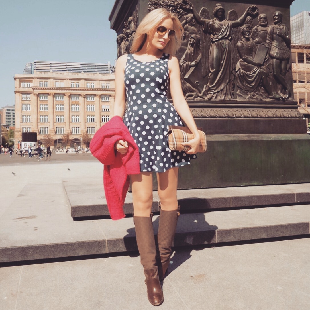 Pattern mix – outfit of the day boucle jacket:@chanelofficial, military boots: @gucci, dress:@ferragamo, sunglasses @dsquared2, handbag:@burberry #Galiainaction #Galiaoutfits#Galiaccessories #fashion #style #chic #couture #ootd#Instafashion #picoftheday #colorful #frankfurt#instagood #instago. Photo by @leonardotrento