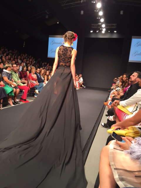 Again we had a few minutes to run upstairs and change – new show, new outfit! Next up was the long-awaited Camila show. I have heard a lot of good things about her. And true to everything that I’ve been told, the collection was very feminine, with lots of silk and flowing long designs. The main inspiration was the Samurai-like kimono cut. I was highly impressed by Camila’s ability to make this look incredibly soft and feminine, yet at the same time, strong and expressive! It felt like being in the middle of a girl-only martial arts movie-dream, with the actresses walking down the runway, exposing their inner femme fatale strength to the world. Next up was the Jusef Sánchez show. This was unique because the show started with a DJ scratching live directly on the runway – so you can imagine the sheet energy and vibe in the Garden Tent! Sánchez’s creations were rock-chic-inspired with bright color pieces mixed up with my favorite black and white look. We saw long designs made of feather-light silk material, flowing so lightly that would make any ocean wave green with envy! My absolute favorite thing was his mix of a pant leg, short leg and half skirt all in one piece of clothing! I know, sounds crazy, but look at the photos below. This is definitely something I would wear to the Ibiza openings next spring 2016 – especially the white outfit! It’s unlike anything that I have seen before and definitely not something anyone would forget seeing you in. I wouldn’t wear it to the Vienna Opera Ball, but definitely on a special occasion where I would want to make a stylish, unique and unforgettable impression… dare to be bold!
