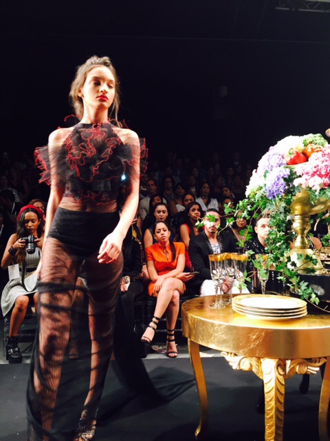 Last but not least was the Moisés Quesada show. It was an interesting concept because the entire length of the runway was filled with glass tables, vases, flowers, cutlery, dishes, flutes and other interesting home accessories. The setup allowed the models to walk around the entire runway. The collection was small but tight. Less is more – I always say rather a smaller collection but with killer pieces! And that’s what Quesada did. He played a lot with black, white and red this season. The designs were form fitting, very feminine and some fully see-through. The models looked like live man-eaters, and it felt like being in the middle of a secret vampire meeting. His Pièce de résistance was a long white wedding dress that came out at the very end. What a fitting and innocent ending to a dark and intriguing tale! The vampires left the room, the lights came on and the show was over. My jet lag was not loosening its tight grip on me. In fact, it was possessing me from the inside out. While everyone made their way to the loud and lavish after-show party, I only had dirty thoughts of my skin caressing the cold crisp bed sheets. Besides, tomorrow was the big day! The last day of the Dominicana Moda, and the evening of Jean Paul Gaultier’s long-awaited fashion show! I wanted to look well rested and fabulous for his amazing event! I bid my team farewell and disappeared into the gold-mirrored elevator.