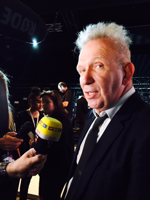 I have to mention here how amazingly down to earth, warm, sincere, funny and kind Mr. Gaultier is! Usually designers like to keep their show a mystery and are not happy with many people hanging around before the show and especially not directly around the runway during rehearsals. He waned to have us around him, and didn’t mind at all when we asked a hundred questions and made a thousand photos. He was very patient with everyone. I respect that so much about him. He was so cool, calm and collected – and this an hour before the highly anticipated show! Bravo Mr. Gaultier, another great reason why you are my fashion idol! Jens got a chance to have a nice interview with him, and I ran around being the curious monkey that I am – gathering information, images and memories of this wonderful experience. The press people made a circle around JPG and everyone wanted to have a piece of him. I sat at the front row, admiring the atmosphere. I was in fashion heaven! It was funny because I kept running Jens’s videos with my loud excited comments beside him. Thankfully my chatter is not to be heard on the video they showed on the VOX Prominent show – a famous German TV show about celebrities. Needless to say, I look like a cartoon CIA agent, hanging beside Mr. Gaultier on the video. Don’t ask! ;-) (Video on my YouTube Channel).