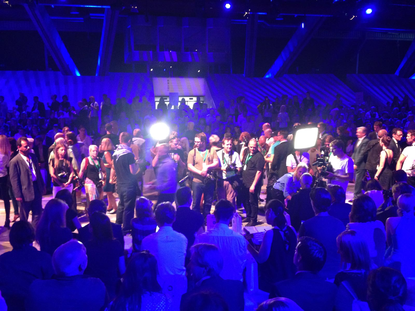 We were invited by Nespresso, and the rep greeted us with VIP passes and guided us to the lounge. There were beautiful people everywhere, and I felt like Gali in Wonderland, cushioned by the cold warmth of champagne. We were given our tickets and ushered into the first show. There were cameras everywhere with flashes going off like deranged alien eyes. As the lights dimmed, we saw who the camera-magnet was. It was Tommy Hilfiger in his snazzy red pant, supporting the Designer For Tomorrow show that we were about to see. Klaus Wowereit, the mayor of Berlin was sitting not far away from us. He was pleased to hear that I am a Canadian enjoying Berlin, and so we chatted about Toronto, writing and fashion. My gay friend Dan started flirting heavily, his eyes glazed over by the fantasy of being “Berlin’s First Lady”. Mr. Wowereit was not responding to him, so Dan got angry in his sassy bitchy way, got up and loudly said, “UH! Don’t pay attention to me, whatever! I’m going to flirt with Tommy. By the time you finish your airport, we will all be already dead anyways!” and stormed away. Oh my Lord. I love my friends. The word drama doesn’t do it justice. A man behind us almost fell on the floor due to laughing hysterics, and I wanted to crawl under my seat. Thankfully the show has started, and all politics were quickly forgotten.