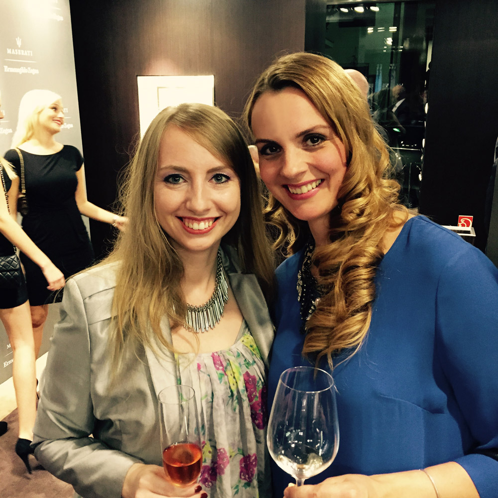 Our first stop was the chic Ermenegildo Zegna store located on the Goethestrasse. This fabulous Italian designer – who creates timeless pieces for men – joined forces with Maserati to bring us the glamorous Italian flavor on this chilly evening. As we arrived the store was already full and popping at the seam with Frankfurt VIPs, celebs and stylish cool people. The location was lined up with beautiful new Maseratis outside and men with chic black Zegna suits protecting them. Knowing my love for cars and choppers, I got stuck in front of the cars, observing every little detail and gadget – I was very impressed! Inside the mingling was already strong in action. As we stepped in, we were given a glass of cold rosé champagne and delicious bites of Venchi Italian chocolates. Not to be missed in action were both CEOs – Gildo Zegna and Harald J. Wester of Maserati. The guests were enjoying themselves – drinking and shopping simultaneously, smiling and having a good time. The event was organized by Frank Kuhlmann, who did a great job of bringing the interesting people together. I enjoyed looking at the new collections that Zegna had on display. I fell in love with a particular dark gray wool suit – fit for a king, or at least James Bond! I was happy to see many of my acquaintances, which I have not seen in a while, chat with them about life and also meet new interesting people.