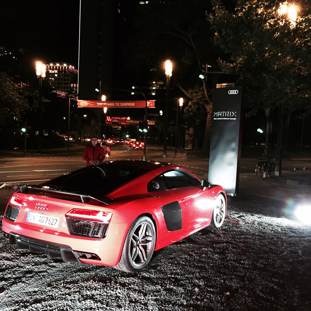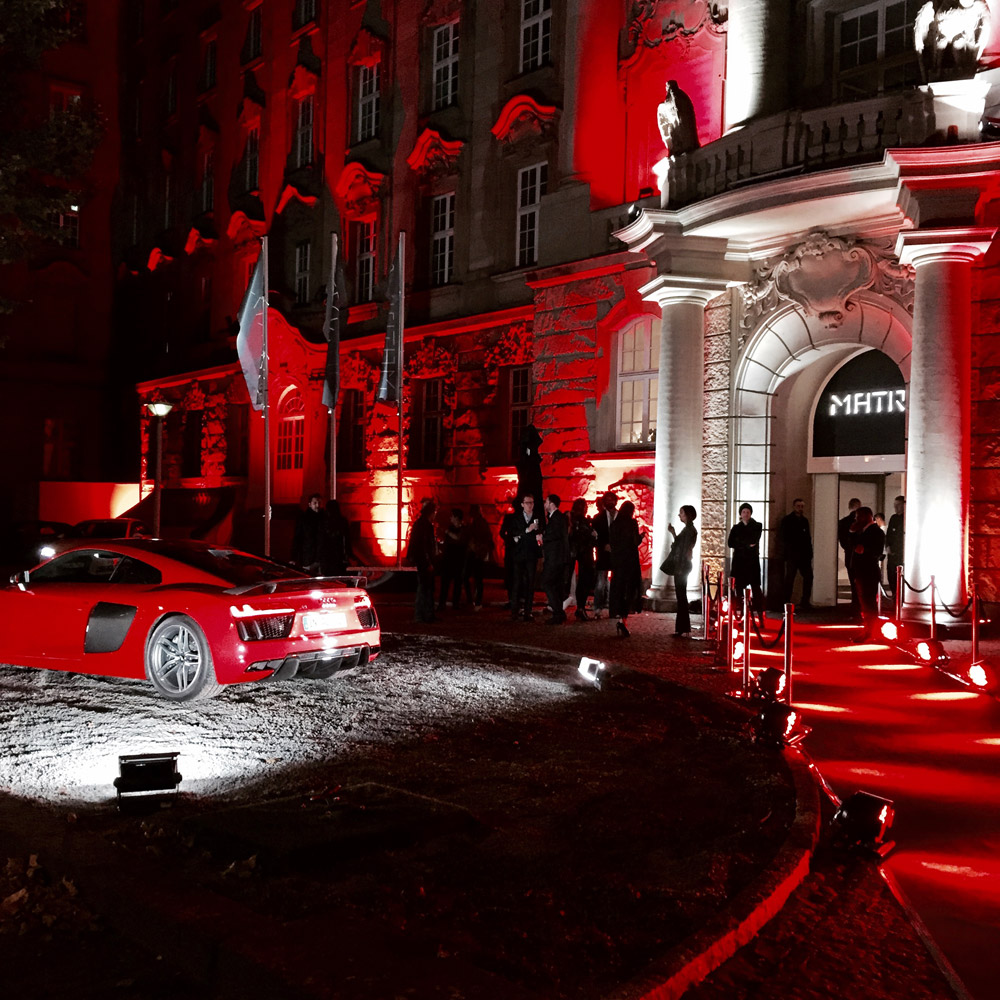As the hours passed, we had to rush to the next event, which was the pre opening of the Matrix Pop Up Club. I didn’t know what to expect but was very excited to see the venue, because Madjid Djamegari was posting little teaser bits on Facebook during the week and the photos looked fantastic! The Matrix concept was brought into life by the Gibson Club and Audi – two brands that are definitely in the lead with trends and innovation. When our car dropped us off at the pop up location at Ludwig-Erhard-Anlage, we couldn’t help but get excited about the view. The entire building facade was glowing a bright crimson red! The front lawn was decorated with a hot red Audi R8 to match. It looked like we arrived at Dracula’s winter palace. As we walked down the red carpet, we were greeted with open arms by a smiling and very happy Madjid, along with Markus and other men in black. We had a nice chat outside and the gentlemen welcomed us into their special event.