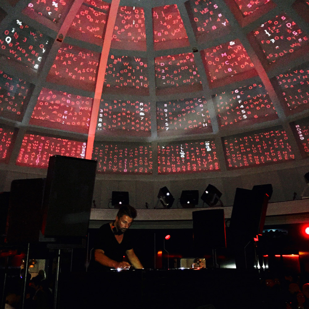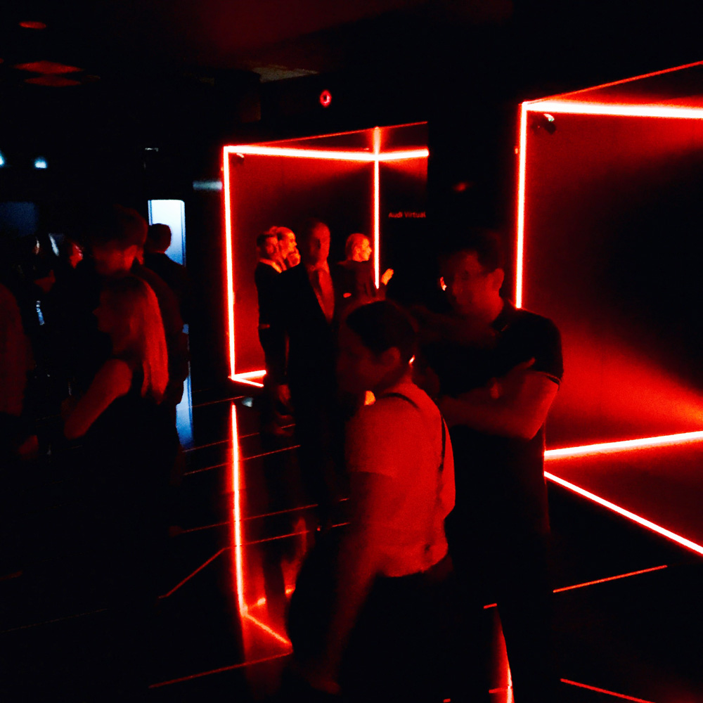 The beautiful new Audi A4 Quattro was presented on the ground level in the middle of a bright white spherical area. The contrast of the red car in the white dream-like sphere was amazing! The surreal journey was starting. We were handed a white Audi bracelet, told that this shall be our close companion and guide throughout the night. The elevator doors had white laser lights and a bright red interior, which took us to the top level of the adventure. As we got out of the lift and stepped into the room, it was indeed like stepping into the Matrix! My breath was taken away for a few seconds. We found ourselves inside of a large dark round room, with an intrinsic dome roof. It was made of many squares that got smaller towards the peak. On these squares were numbers and digits running down, like a code being generated in the Matrix! It felt like being in an ancient building in Rome, but directly in the heart of Frankfurt! DJ duo Andhim were situated in the middle, surrounded by a large bar area. The floor had computer motherboard-like marks, which were glowing with interchanging white and red lights. On the outer edges of the room, there were futurist virtual reality stations, waiting to take the VIP guests on an Audi tour in another galaxy. On our way to the bathroom we stumbled into a secret room with black light activated art on the walls. There was a bar with a huge variety of gins and tonics. Apparently this was the infamous gin room offering its many different delights.