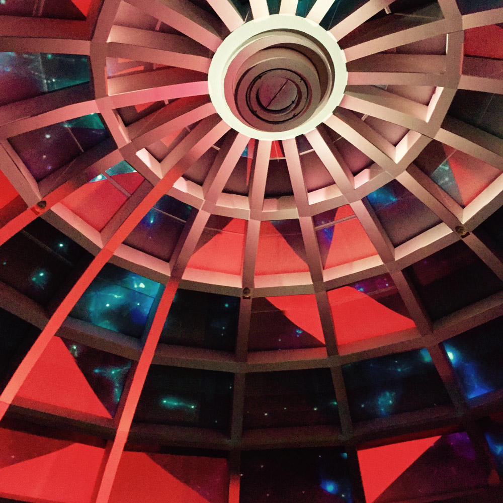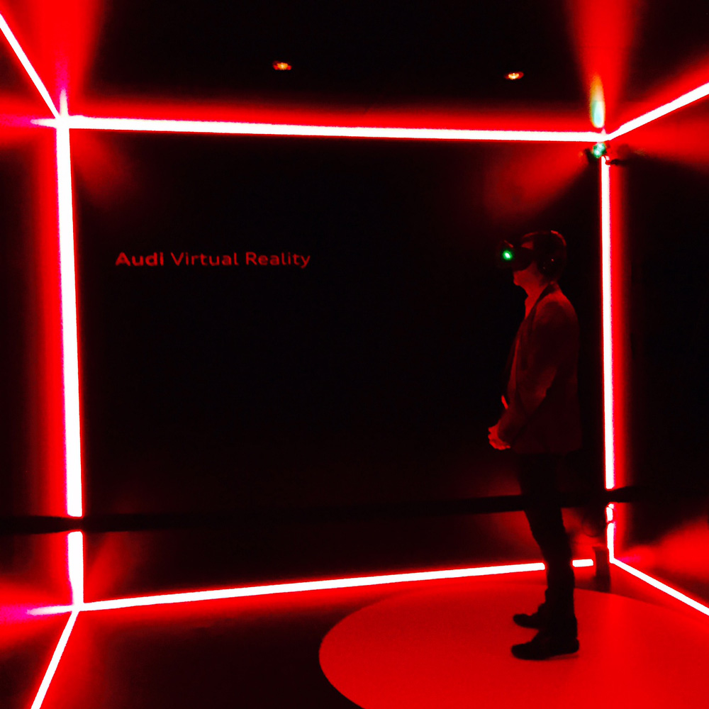 The beautiful new Audi A4 Quattro was presented on the ground level in the middle of a bright white spherical area. The contrast of the red car in the white dream-like sphere was amazing! The surreal journey was starting. We were handed a white Audi bracelet, told that this shall be our close companion and guide throughout the night. The elevator doors had white laser lights and a bright red interior, which took us to the top level of the adventure. As we got out of the lift and stepped into the room, it was indeed like stepping into the Matrix! My breath was taken away for a few seconds. We found ourselves inside of a large dark round room, with an intrinsic dome roof. It was made of many squares that got smaller towards the peak. On these squares were numbers and digits running down, like a code being generated in the Matrix! It felt like being in an ancient building in Rome, but directly in the heart of Frankfurt! DJ duo Andhim were situated in the middle, surrounded by a large bar area. The floor had computer motherboard-like marks, which were glowing with interchanging white and red lights. On the outer edges of the room, there were futurist virtual reality stations, waiting to take the VIP guests on an Audi tour in another galaxy. On our way to the bathroom we stumbled into a secret room with black light activated art on the walls. There was a bar with a huge variety of gins and tonics. Apparently this was the infamous gin room offering its many different delights.