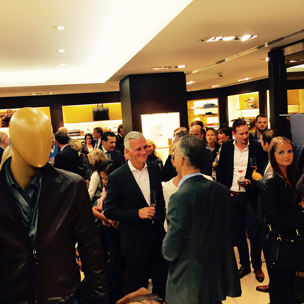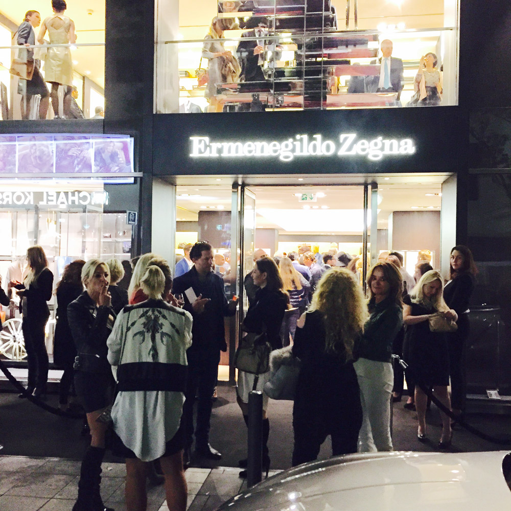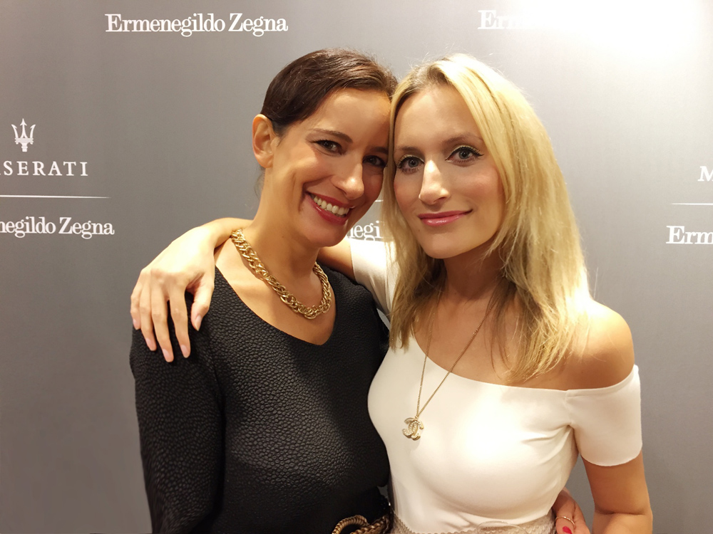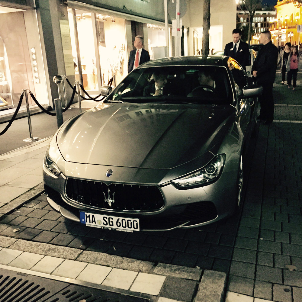 Our first stop was the chic Ermenegildo Zegna store located on the Goethestrasse. This fabulous Italian designer – who creates timeless pieces for men – joined forces with Maserati to bring us the glamorous Italian flavor on this chilly evening. As we arrived the store was already full and popping at the seam with Frankfurt VIPs, celebs and stylish cool people. The location was lined up with beautiful new Maseratis outside and men with chic black Zegna suits protecting them. Knowing my love for cars and choppers, I got stuck in front of the cars, observing every little detail and gadget – I was very impressed! Inside the mingling was already strong in action. As we stepped in, we were given a glass of cold rosé champagne and delicious bites of Venchi Italian chocolates. Not to be missed in action were both CEOs – Gildo Zegna and Harald J. Wester of Maserati. The guests were enjoying themselves – drinking and shopping simultaneously, smiling and having a good time. The event was organized by Frank Kuhlmann, who did a great job of bringing the interesting people together. I enjoyed looking at the new collections that Zegna had on display. I fell in love with a particular dark gray wool suit – fit for a king, or at least James Bond! I was happy to see many of my acquaintances, which I have not seen in a while, chat with them about life and also meet new interesting people.