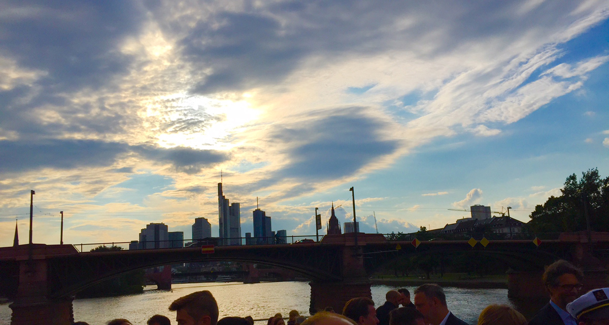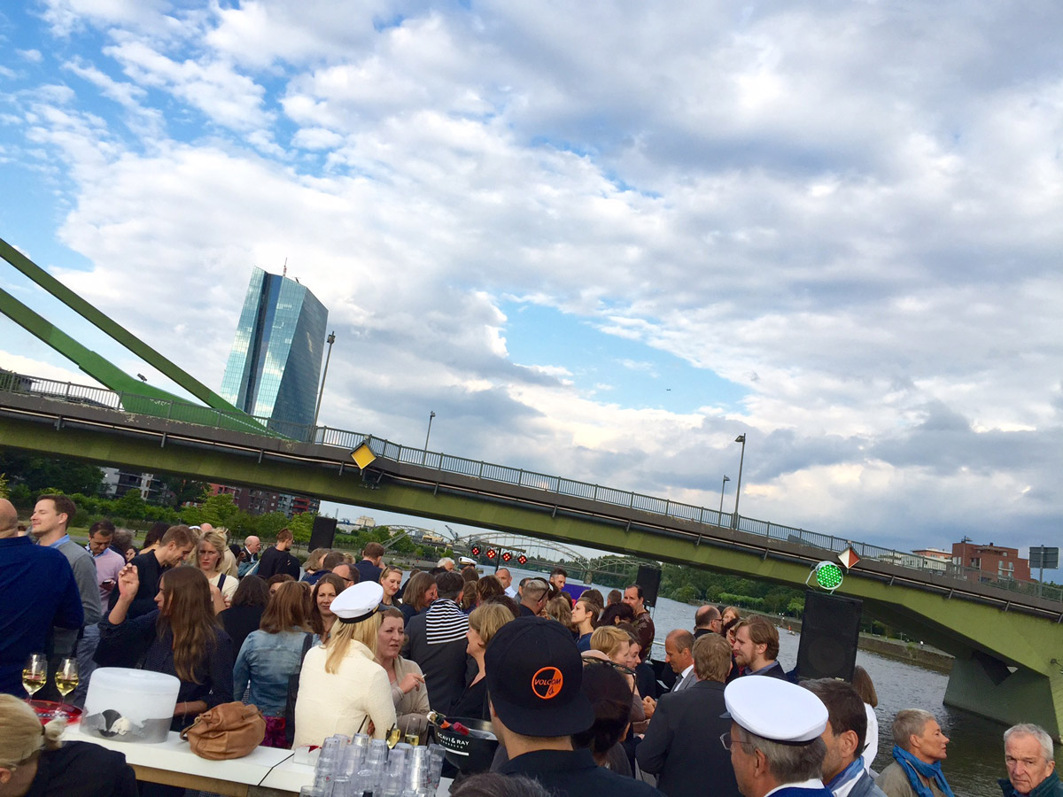 Back at the upper deck, the music was making the boat vibrate, and the feeling of floating smoothly on the main was unforgettable. Many photos were taken, which I am sure will be seen in the Journal Frankfurt magazine very soon. After the hours melted away, the boat was docked again. Nobody wanted to leave because the evening was so fabulous!