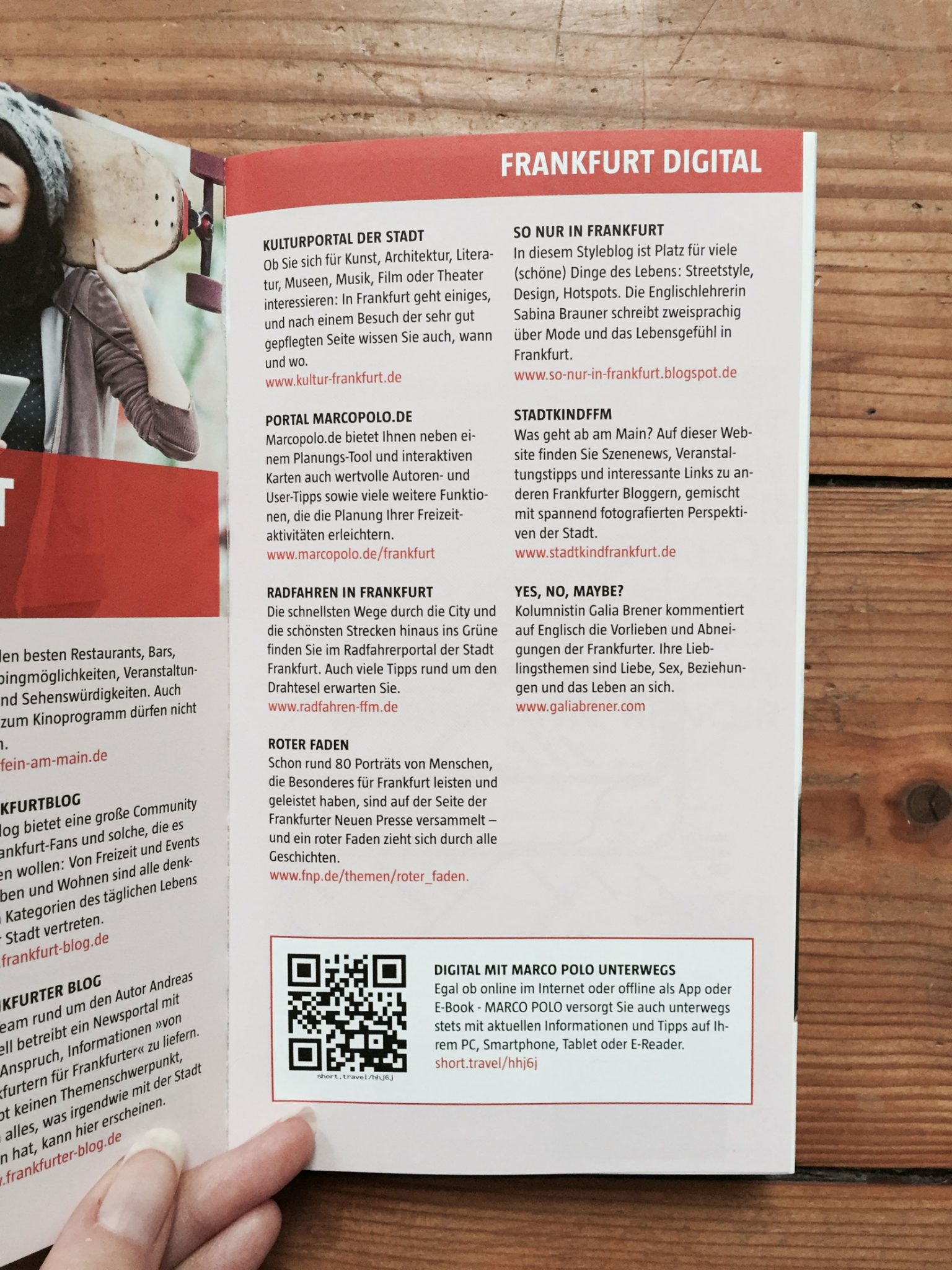 My blog Yes, No, Maybe? is included in the Marco Polo Frankfurt city guide 2015!