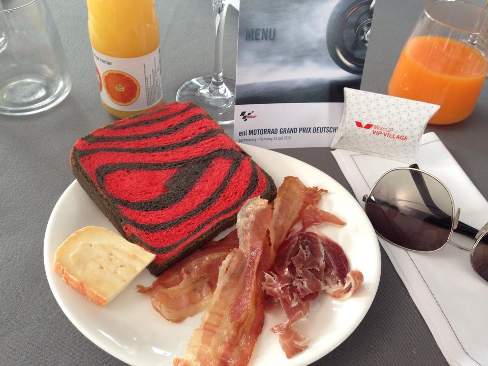I felt the buzzing energy all around me. Journalists, photographers and TV crews were scurrying around like mad chickens without their heads, trying to capture the exciting moments before the race. We were invited by the prestigious Bridgestone tire brand, and they made sure our VIP weekend was one to remember. They set us up in a 5-star boutique hotel in a picturesque town beside the racetrack. As I walked into my room, I saw a huge bright red beach towel and cap waiting for me on the bed. As I came closer to the cap, I noticed that it was signed by the one and only German race star Stefan Bradl! What an excellent and rare present.